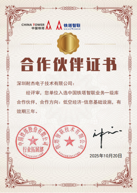 当专精特新的技术深耕遇上行业龙头的资源赋能,一场重塑智联生态的合作正式启航!近日,深圳耐杰电子技术有限公司(耐杰光电)凭借在多光谱智能跟踪光电领域的硬核实力,成功入选中国铁塔2025年智联业务一级库合作伙伴,成为低空经济赛道上的重要战略携手。